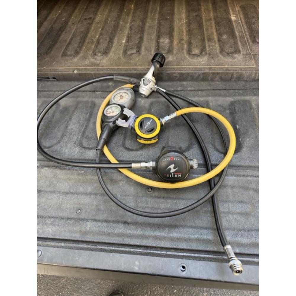 Aqua Lung Titan Yoke First Stage, Titan Primary Second Stage, and Aqua Lung ABS Second Stage Octopus. Suunto Console with Depth and Pressure Gauge.